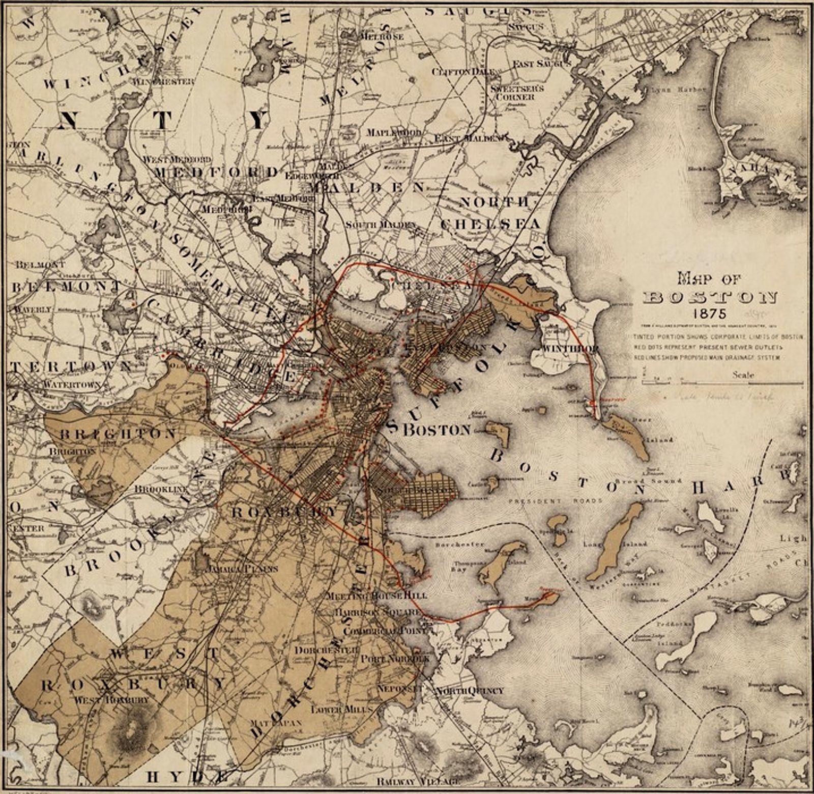 Two years later, in 1873, a bill was introduced into the legislature proposing the annexation of West Roxbury, Brighton, Charlestown,  and  Brookline.